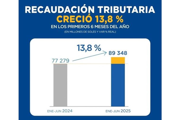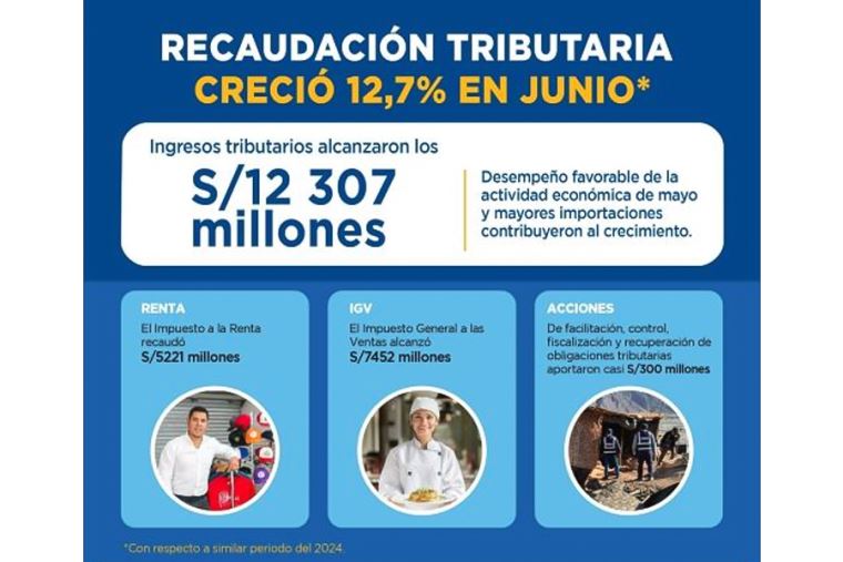 En junio, los ingresos tributarios netos del Gobierno central alcanzaron los 12 307 millones de soles. Con ello, la recaudación del mes experimentó un crecimiento de 12.7% respecto al mismo período del 2024, representando el décimo tercer mes de crecimiento consecutivo de los ingresos tributarios nacionales.