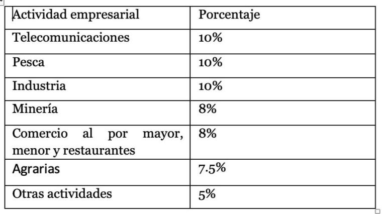El porcentaje por aplicar dependerá de la actividad que realiza el empleador considerando la información detallada en la Clasificación Industrial Internacional Uniforme (CIIU) de las Naciones Unidades, salvo ley en contrario. Por ejemplo, una empresa que pertenece al sector hidrocarburos repartirá 5% pues su regulación, la Ley General de Hidrocarburos, hace que ingrese en la categoría denominada “otros”, lo mismo ocurre con las empresas del sector construcción.